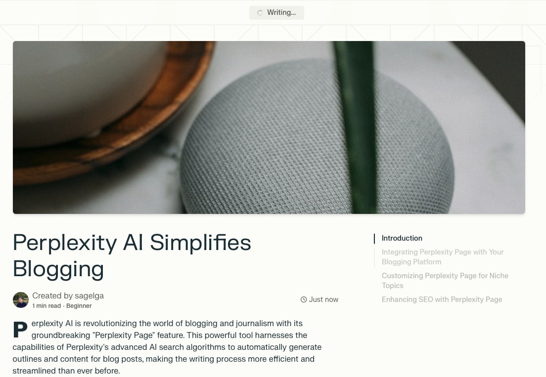 I woke up today and noticed that Perplexity AI, my personal research copilot, has introduced their newest product "Perplexity Page". This new feature is a game-changer for how we can blog and journal. With its ability to automatically create outlines and content, Perplexity Page is set to revolutionize the way we produce written content, making the process more efficient and intuitive for everyone, including me.