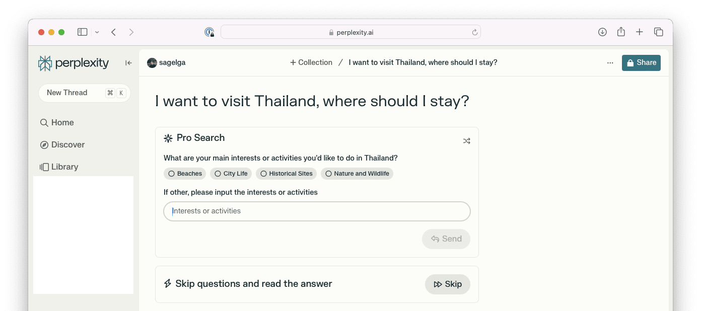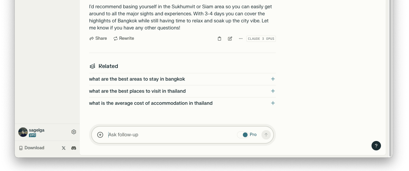 Best of all, the option to ask follow-up questions. For example, if I would like to visit Thailand and needed the place to sleep, but I clearly did not state what is my preference, how long and when I will visit Thailand, or what town will I visit. Perplexity AI will ask for a follow-up question to further clarify my needs.