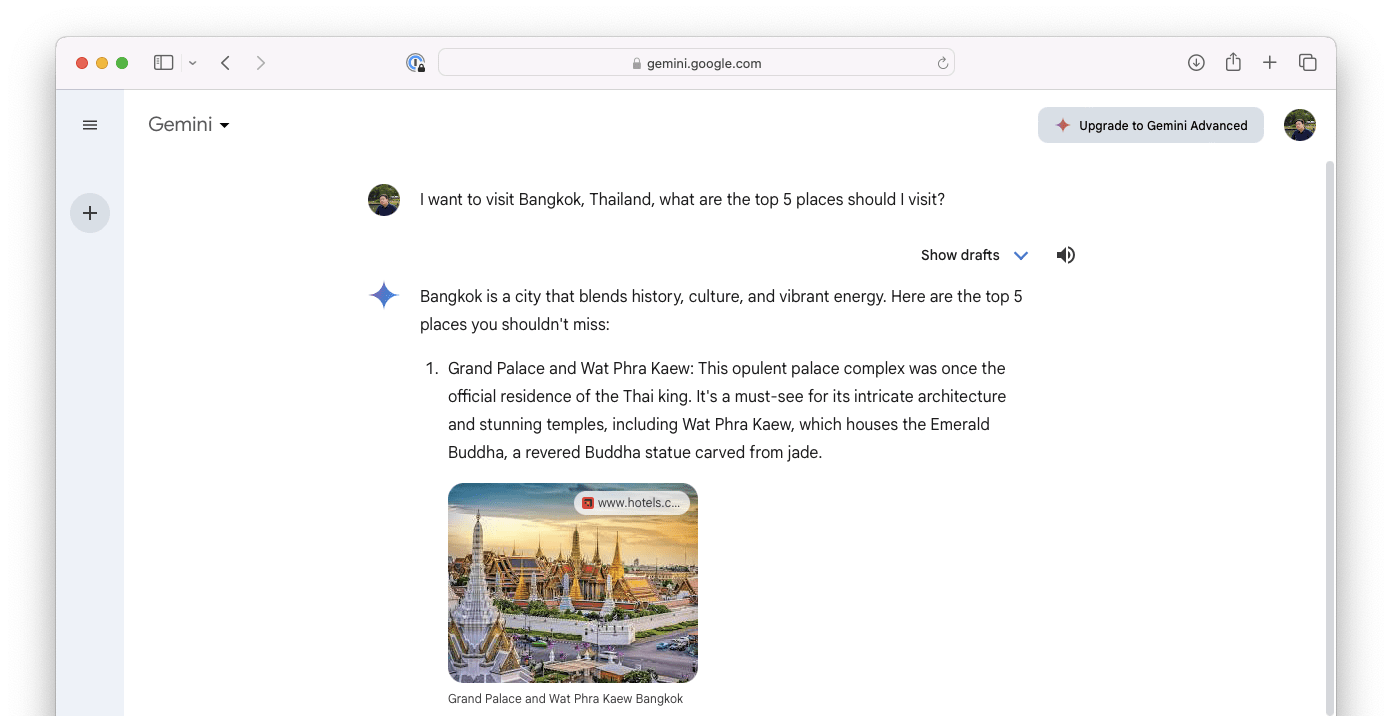 Price: Free (with the Advanced AI pack with the price tag of $20 a month, offers you with Gemini Ultra, Gemini integrations with Google Workspace services like Gmail, Docs, Slides, and Meet, as well as 2TB Google One shared storage and additional Google One Premium benefits).