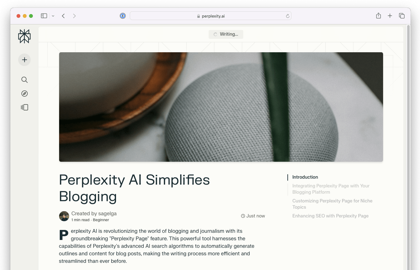 I woke up today and noticed that Perplexity AI, my personal research copilot, has introduced their newest product "Perplexity Page". This new feature is a game-changer for how we can blog and journal. With its ability to automatically create outlines and content, Perplexity Page is set to revolutionize the way we produce written content, making the process more efficient and intuitive for everyone, including me.